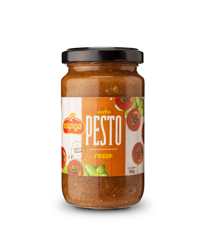 O Molho Pesto Rosso Espiga, receita de pesto, com manjericão e o típico queijo curado e Parmesão, diferencia-se de um molho pesto tradicional pelo ingrediente base utilizado, o tomate seco.